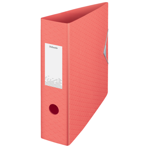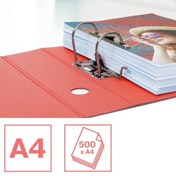 El archivador de palanca A4 Colour'Breeze en coral es ligero y ergonómico, perfecto para organizar hasta 500 hojas. Ideal para llevar contigo o tener en tu escritorio, su cierre elástico asegura tus documentos mientras añades un toque de color a tu espacio. | Referencia Deskidea: ACC628427