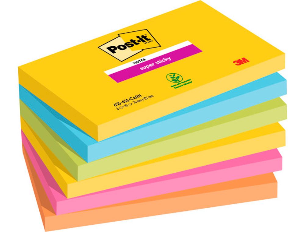 Bloc de notas adhesivas quita y pon post it super sticky carnival 100% pefc 76x127 mm pack de 6 blocs colores