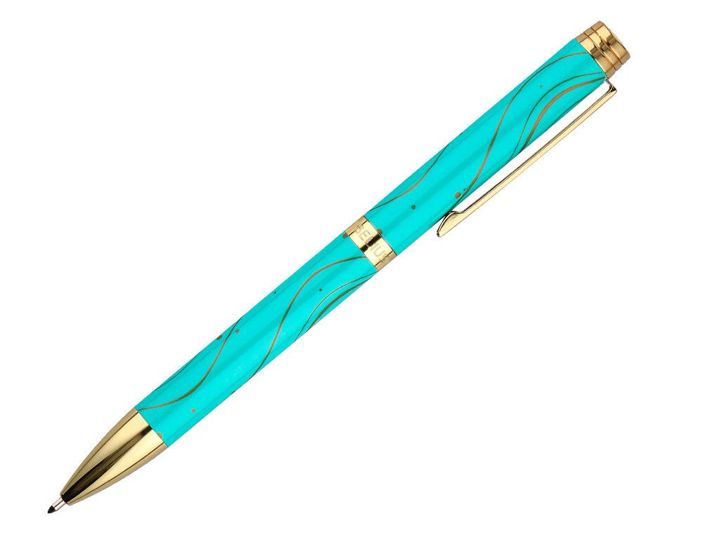 El bolígrafo Belius Aqua en color turquesa y dorado es una pieza elegante que evoca la frescura del mar Mediterráneo. Su tinta azul de 1 mm brinda una experiencia de escritura luminosa y refrescante, ideal para quienes buscan estilo y sofisticación en cada palabra. | Referencia Deskidea: 168858