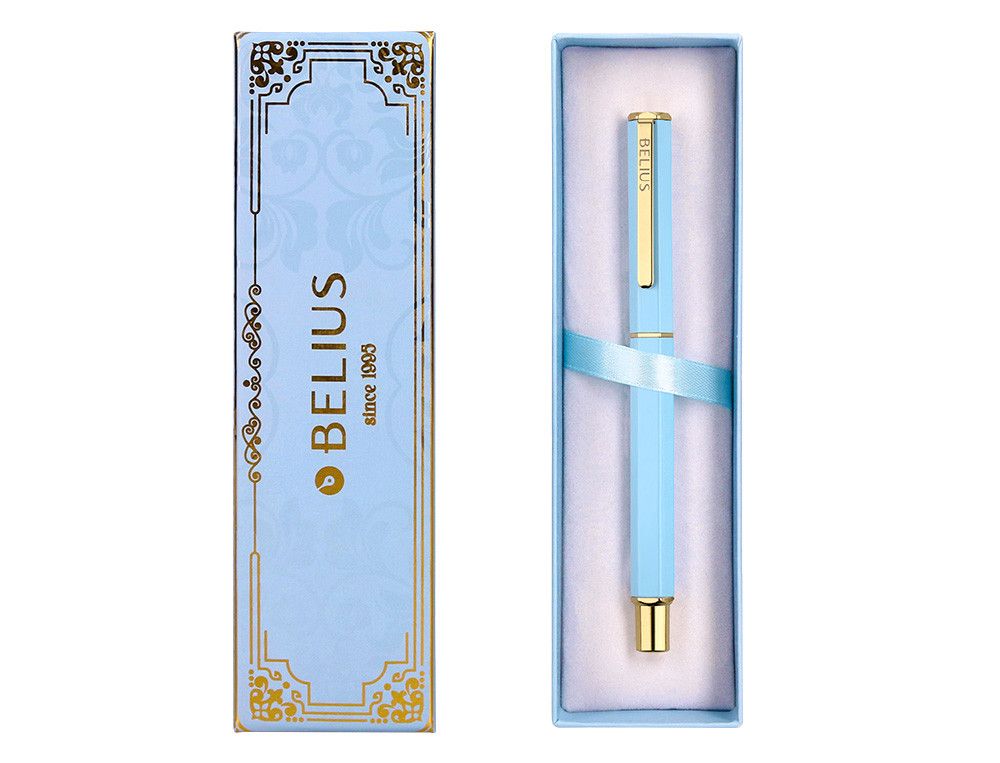 Boligrafo belius macaron bliss forma hexagonal color celeste y dorado tinta azul caja de diseño
