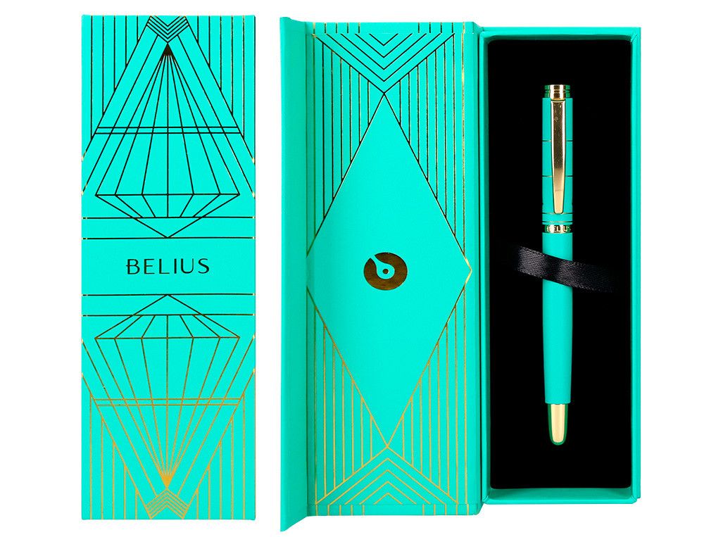 Boligrafo belius soiree aluminio color art deco turquesa y dorado tinta azul caja de diseño