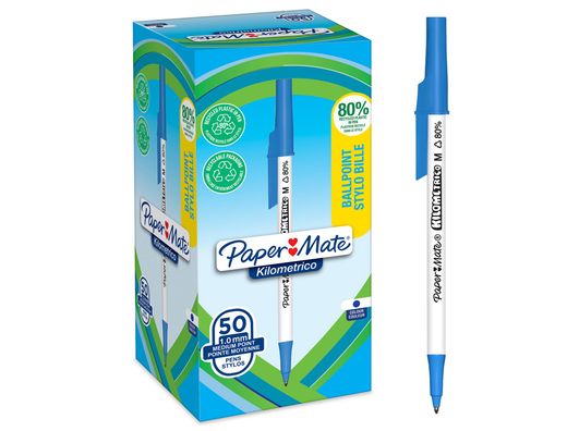 Los bolígrafos Paper Mate Kilométrico son la elección perfecta para quienes buscan calidad y sostenibilidad. Con una punta mediana de 1,0 mm y fabricados en un 80% con plástico reciclado, ofrecen una escritura suave y profesional en tinta azul. Ideal para cualquier ocasión. | Referencia Deskidea: 171021