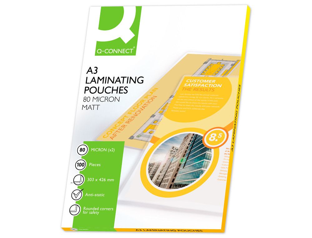 La bolsa de plastificar Q-Connect en tamańo A3 es perfecta para proteger y dar vida a tus documentos. Con 80 micras de grosor y presentada en caja de 100 unidades, asegura una calidad impecable en cada laminado, ideal para el hogar o la oficina. | Referencia Deskidea: 63420