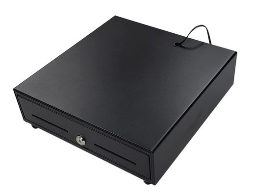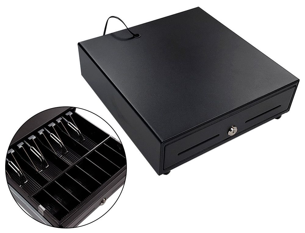 Descubre el cajón portamonedas perfecto para tu negocio. Con un diseńo compacto de 330 x 335 x 105 mm, apertura eléctrica, y una cerradura segura, este robusto cajón negro te permite organizar hasta 8 monedas y 4 billetes con facilidad y eficiencia. | Referencia Deskidea: 162201