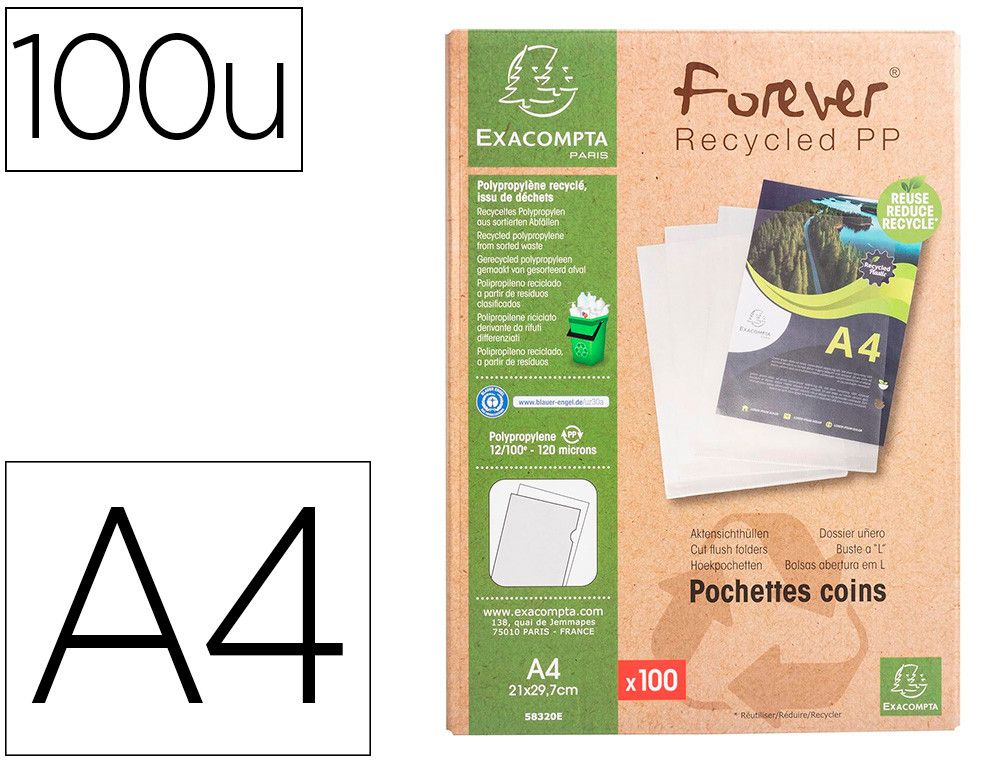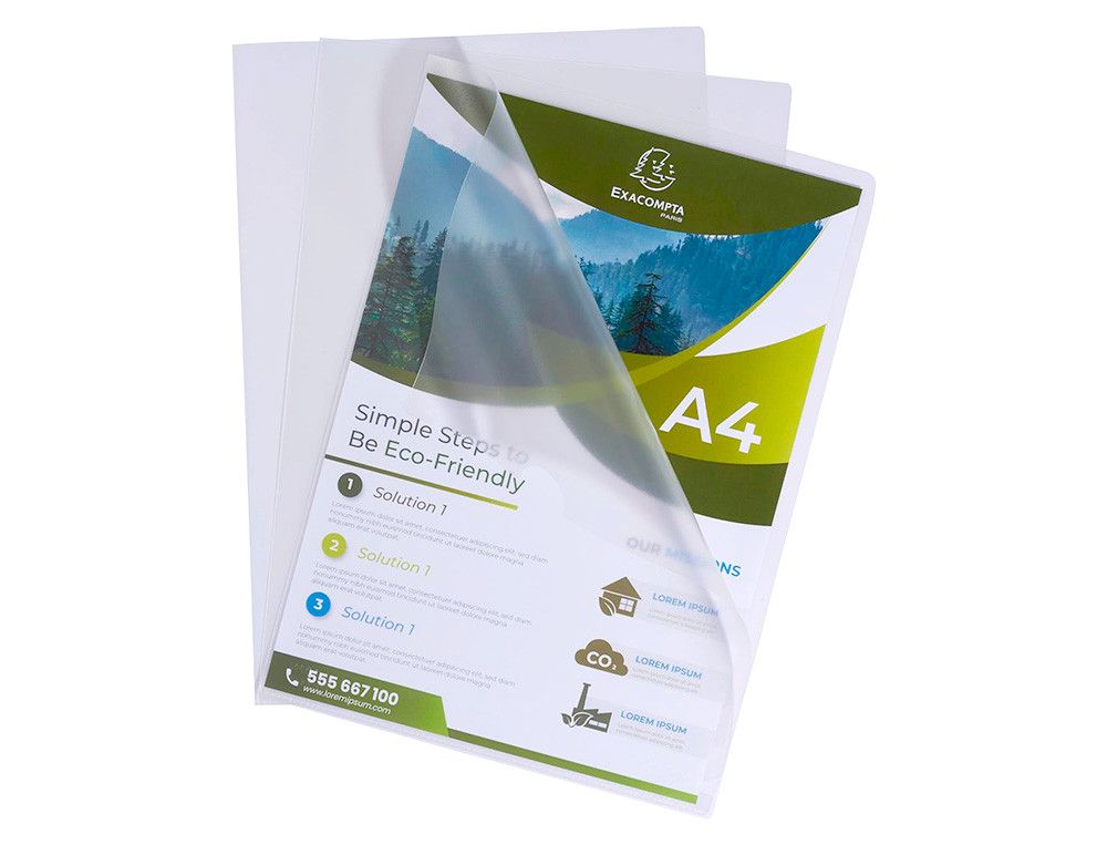 La carpeta dossier uńero Exacompta está fabricada en polipropileno 100% reciclado, ofreciendo una gran transparencia y calidad de 120 micras. Ideal para organizar documentos DIN A4. Presentada en una caja de 100 unidades con certificado Ángel Azul. | Referencia Deskidea: 169231