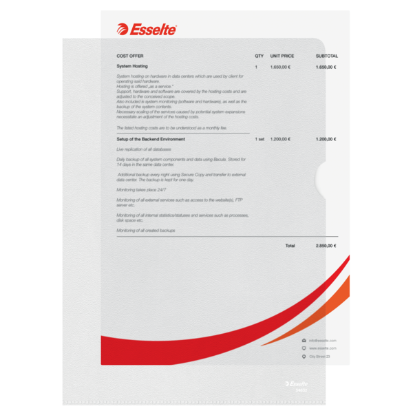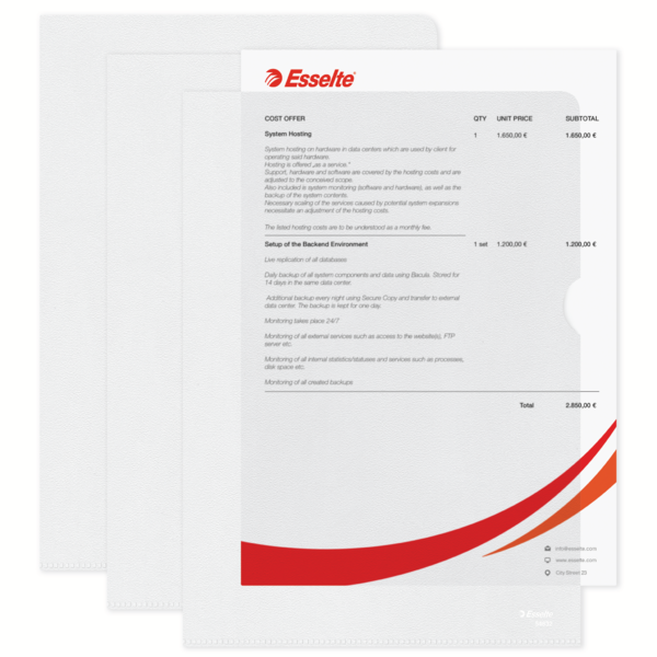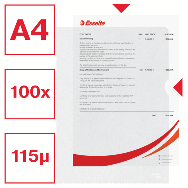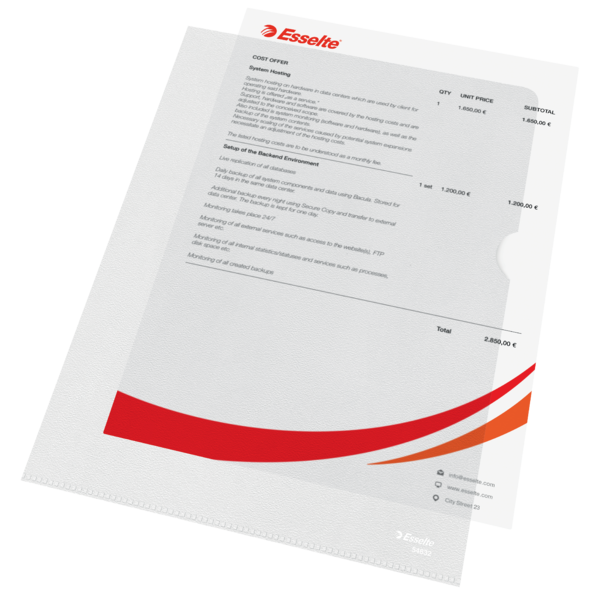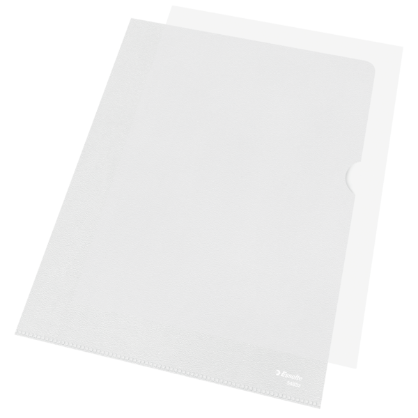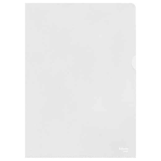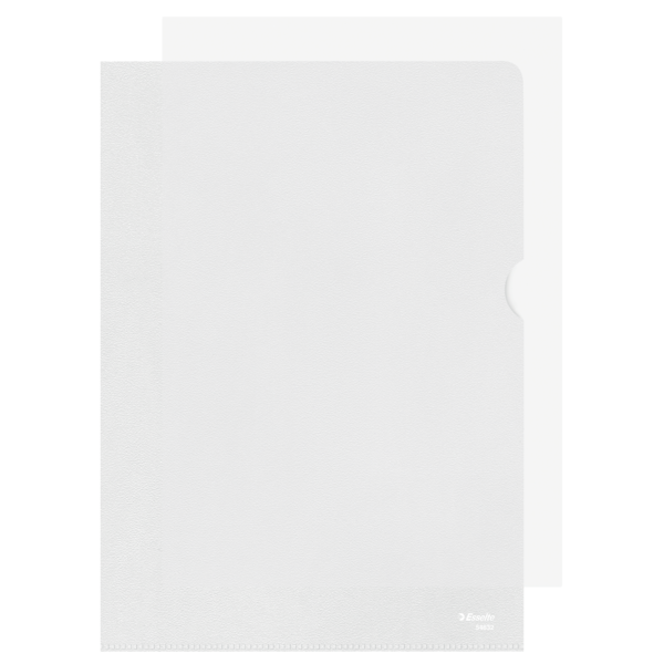 La Carpeta dossier uńero de Esselte es la solución ideal para el almacenamiento diario de documentos. Confeccionada en polipropileno transparente de calidad y con un acabado mate, esta caja de 100 unidades es perfecta para mantener todo ordenado y accesible. | Referencia Deskidea: 168019