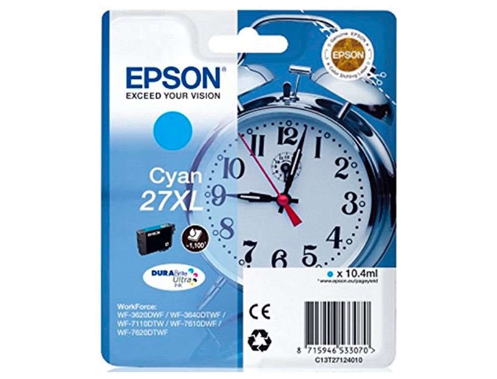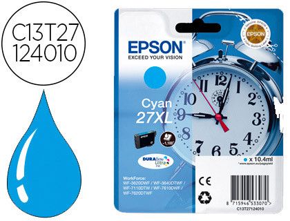 El cartucho de inyección cian EPSON C13T27124012 de 10,4 ml ofrece hasta 1100 páginas de impresión. Compatible con impresoras WF-3620DWF, 3640DTWF, 7110DTW y 76XXDWF, es ideal para quienes buscan calidad y durabilidad en cada impresión. | Referencia Deskidea: 90848