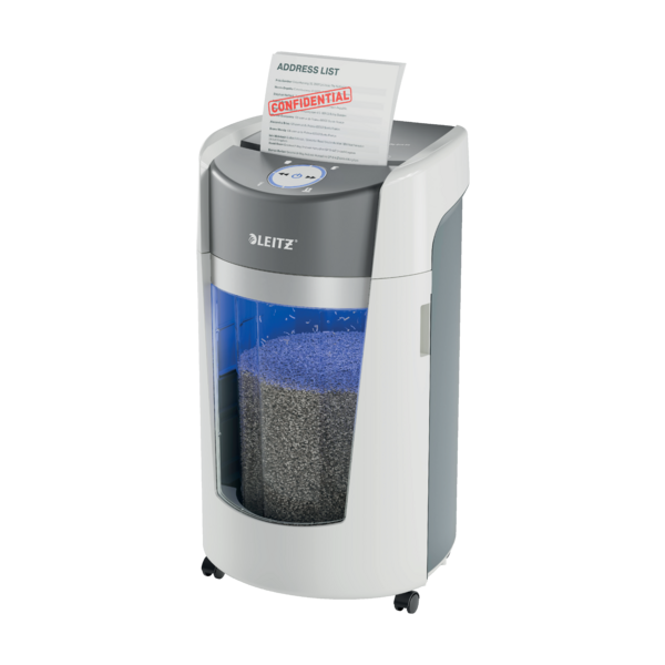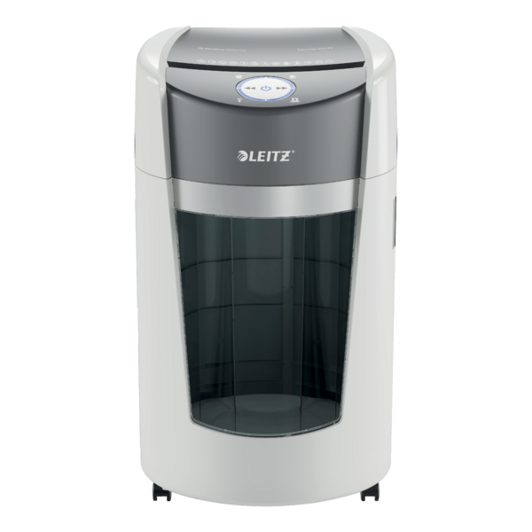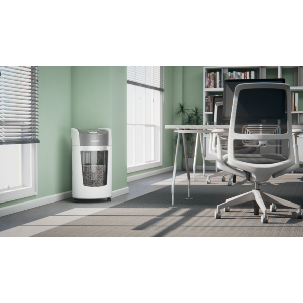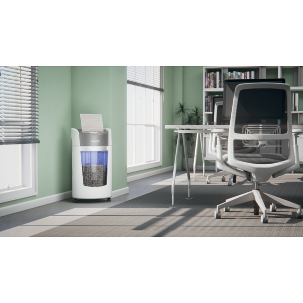 La destructora de documentos Leitz IQ OptiMax Office ofrece seguridad superior al triturar hasta 10 hojas A4 a la vez en microcortes P5. Con una capacidad de 35L y tecnología de giro de papelera, es perfecta para un entorno de trabajo silencioso y eficiente. | Referencia Deskidea: ACC83600000