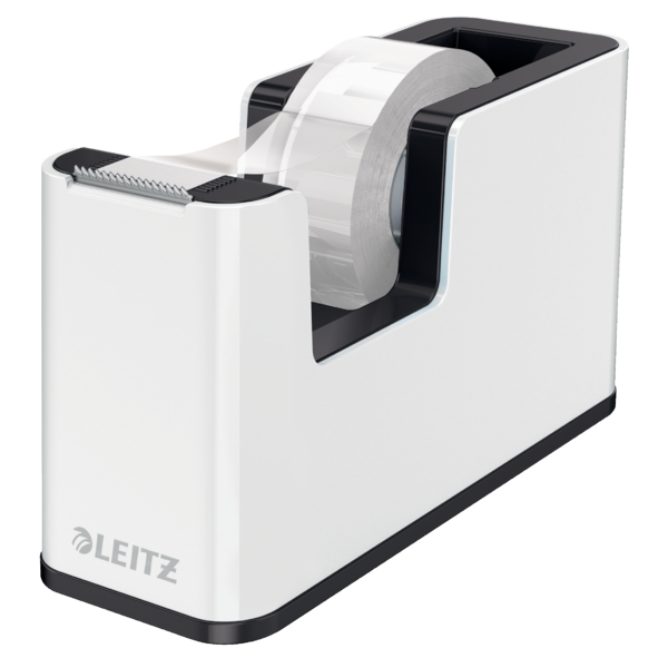 Dispensador de cinta adhesiva Leitz WOW DUAL en negro y blanco, fácil de usar con una sola mano. Su diseño moderno y estable complementa tu espacio de trabajo y garantiza cortes precisos. | Referencia Deskidea: ACC53641095
