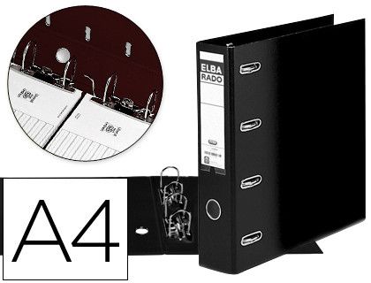 El archivador de palanca Elba Rado Plast en color negro es ideal para organizar documentos A4. Con su doble mecanismo y cantoneras metálicas, asegura durabilidad. Además, su tarjetero permite identificar fácilmente el contenido. Perfecto para oficinas y estudios. | Referencia Deskidea: 72495