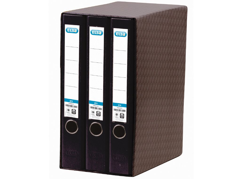 Organiza tus documentos con el módulo archivador ELBA. Incluye tres archivadores A4 de 50mm en elegante color negro, fabricados con cartón robusto y con un diseńo funcional que incluye cantoneras metálicas y tarjetero en el lomo. ˇIdeal para mantener todo en orden! | Referencia Deskidea: 23117