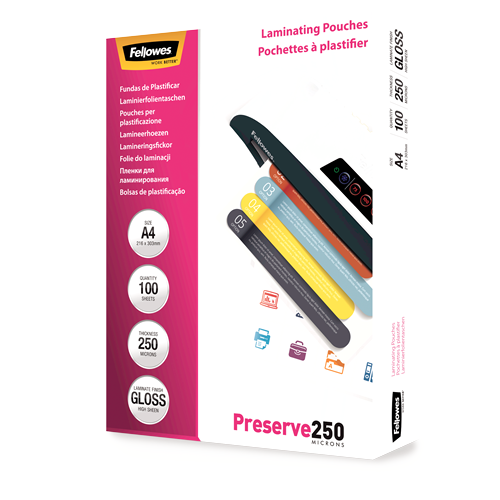 Las Fundas Plastificar Fellowes de 250 micras ofrecen una protección brillante y duradera para tus documentos A4. Pack de 100 unidades, ideales para conservar tus trabajos más importantes y darles un acabado profesional que resalta su calidad. | Referencia Deskidea: 155146