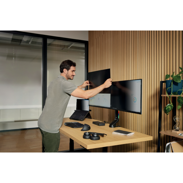 El filtro de privacidad de alta claridad para pantallas de Kensington combina imágenes intensas con una protección eficaz. Los filtros de alta claridad incorporan la tecnología nanolouvre, que supera a los filtros de privacidad estándar, ya que permiten hasta un 40 % más de transmisión de la luz en comparación con estas últimas. Esto se traduce en colores intensos y texto nítido, por lo que son ideales para tareas detalladas y limitan los ángulos de visión a ±30° para proteger la información confidencial. Cada filtro reduce la luz azul hasta en un 28 %, lo que alivia la fatiga ocular y favorece un mejor sueño. Entre las opciones de instalación, se incluyen soportes de pestaña sin marco o cinta adhesiva de doble cara. Un revestimiento antirreflejos reduce al mínimo el deslumbramiento. Resistente a los arañazos y sometido a pruebas de limpieza de calidad militar, cumple rigurosas normas de durabilidad, lo que garantiza una protección prolongada y contribuye al cumplimiento de la confidencialidad de los datos. Incluye una garantía limitada de dos años. * Las comparaciones de rendimiento se realizan frente a los filtros de privacidad de dos direcciones para pantallas de Kensington. Los filtros de privacidad para pantallas diseñados para una alta transmisión de la luz pueden producir artefactos visuales, como efectos de patrón Moiré, cuando se utilizan en pantallas OLED. Los filtros de privacidad de alta claridad solo son compatibles con monitores LCD y LED.