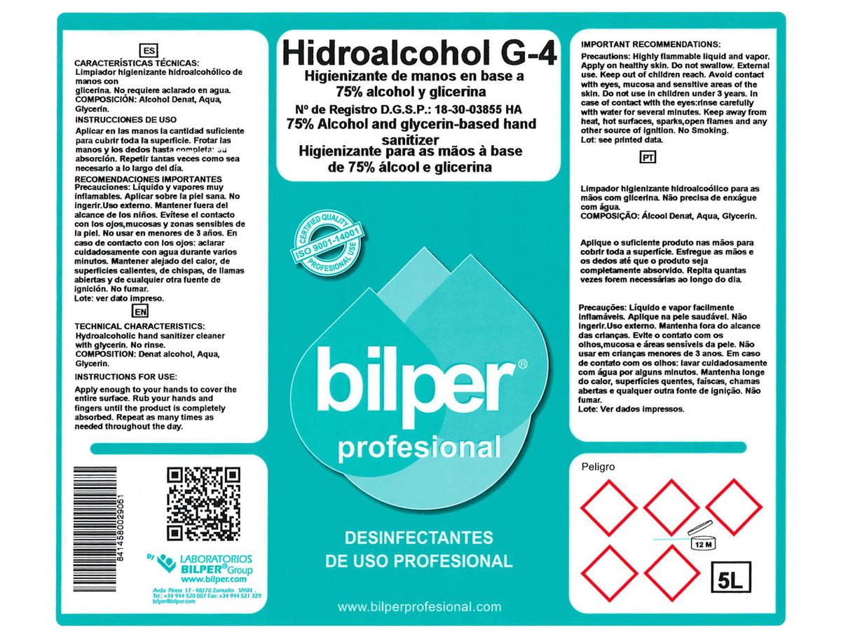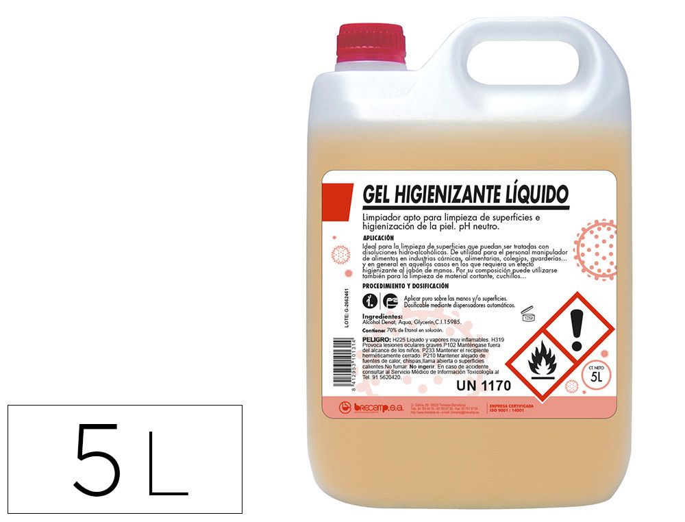 Gel hidroalcoholico higienizante de manos con alcohol y glicerina. ph neutro, garrafa de 5 litros