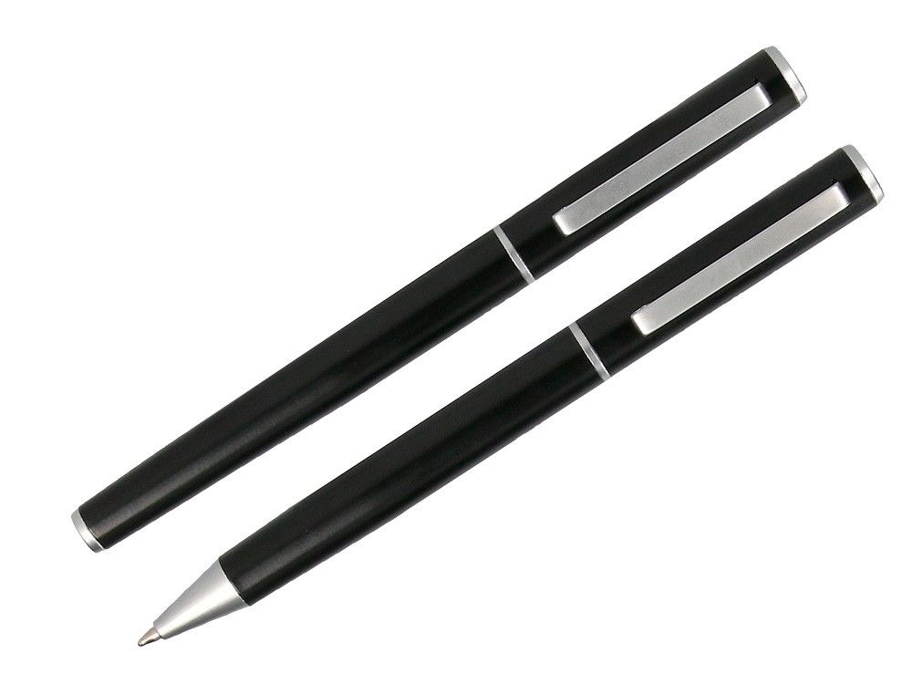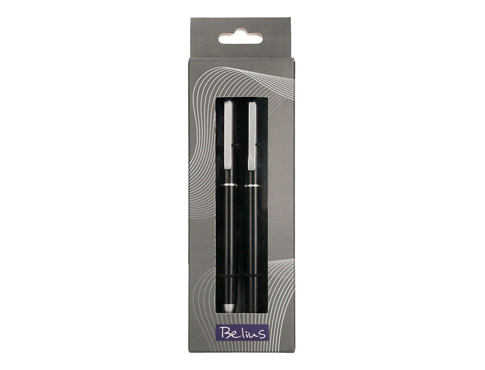 Juego boligrafo y roller belius norwich cuerpo negro mate y detalles cromados satinados en caja regalo