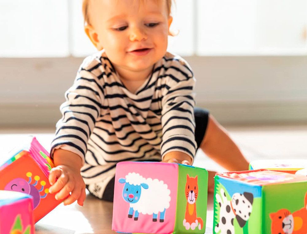 - 6 cubos de tela coloridos y suaves, perfectos para manos pequeñas.
