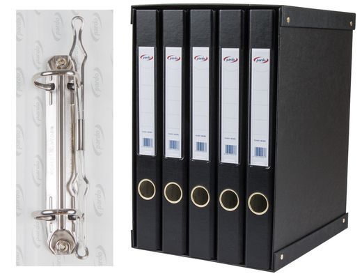 Organiza tu espacio de trabajo con el Módulo 5 archivadores Pardo negro, construido en cartón rígido y PVC forrado que asegura durabilidad. Con su mecanismo de palanca y elegantes refuerzos metálicos dorados, es perfecto para documentos folio y A4. ˇUn toque de elegancia funcional! | Referencia Deskidea: 75412