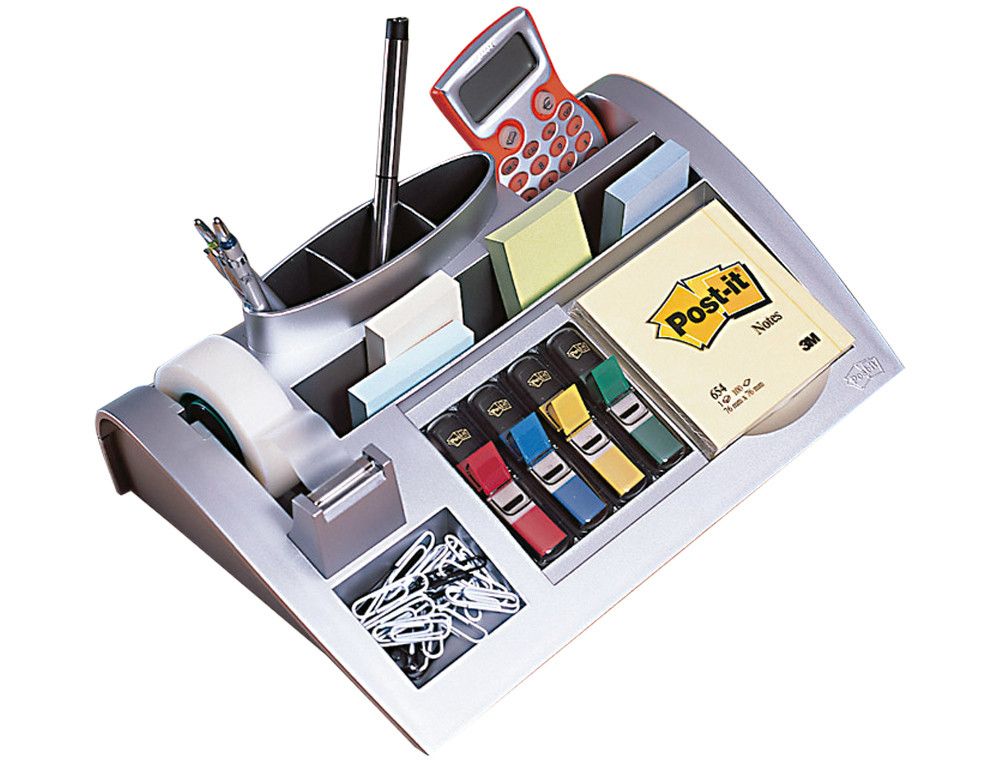 Organizador de sobremesa en poliestireno gris, perfecto para mantener tu escritorio ordenado. Con compartimentos para bolígrafos y accesorios, incluye un bloc de notas post-it, cinta scotch y post-it index. Dimensiones: 245 x 160 x 55 mm. | Referencia Deskidea: 34903