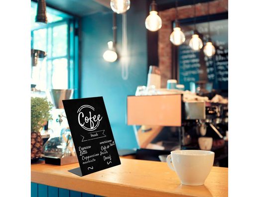 Pizarra de sobremesa Archivo 2000 en forma de L en A4 vertical. Fabricada en metacrilato negro de alta calidad, con superficie lisa no porosa que permite escribir con rotuladores indicados para cristal, garantizando una limpieza rápida sin dejar marcas. Su diseńo compacto y estable es ideal paraentornos de hostelería, comercios, oficinas y centros de información, ofr eciendo una solución práctica, reutilizable y visualmente profesional paracontenidos de frecuentes cambios de información. Color negro. Medidas ext eriores: 85x210x290. Fabricado en Espańa. | Referencia Deskidea: 174686