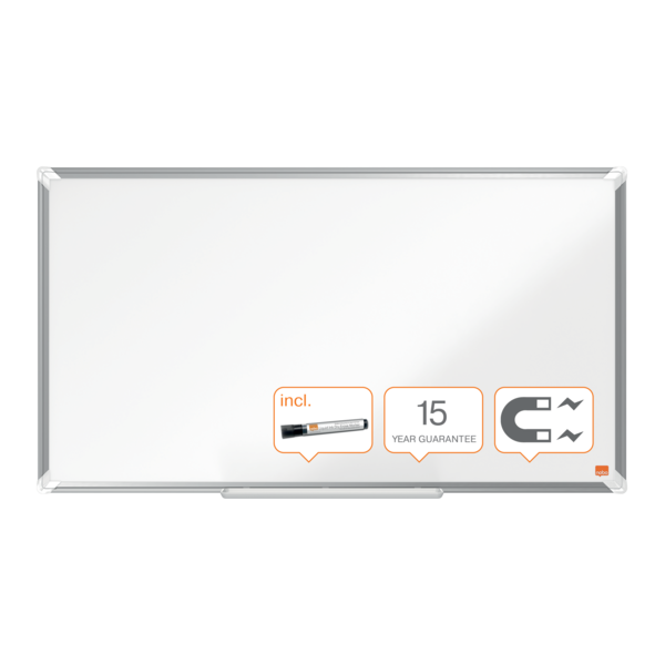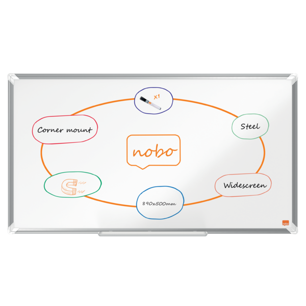 La Pizarra NOBO Premium Plus de acero lacado 890x500mm es perfecta para cualquier espacio. Con un elegante marco de aluminio, ofrece una superficie magnética de alta calidad para un borrado eficiente. Óptima tanto en vertical como horizontal, ideal para tus presentaciones. | Referencia Deskidea: ACC1915371