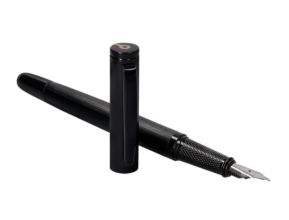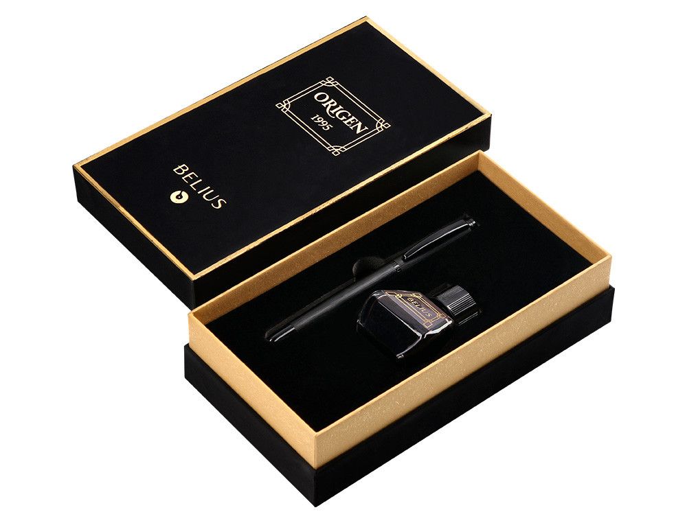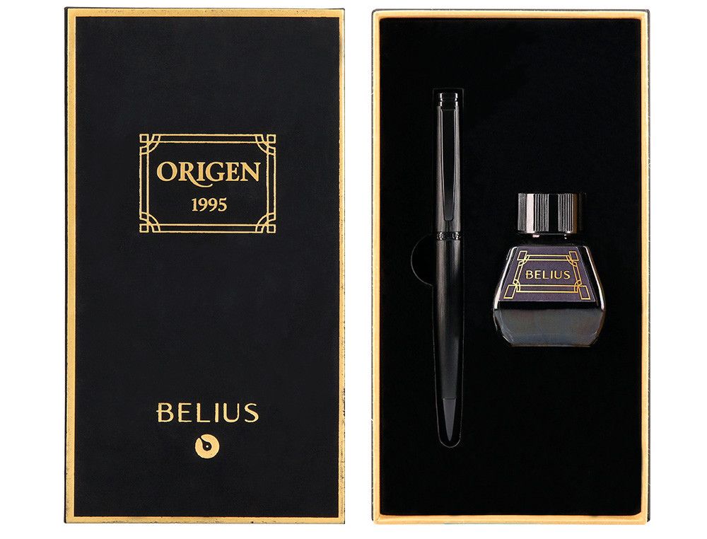 Pluma y frasco de tinta belius origen 1995 aluminio textura cepillada color negro tinta negra caja diseño