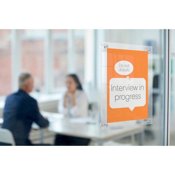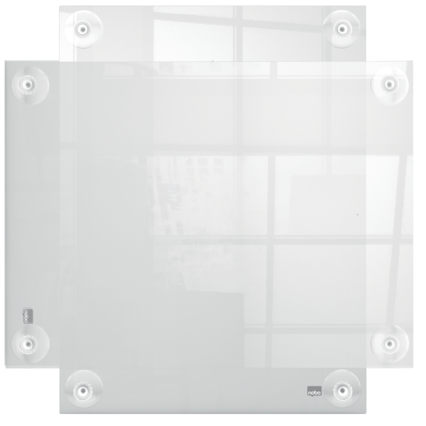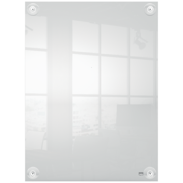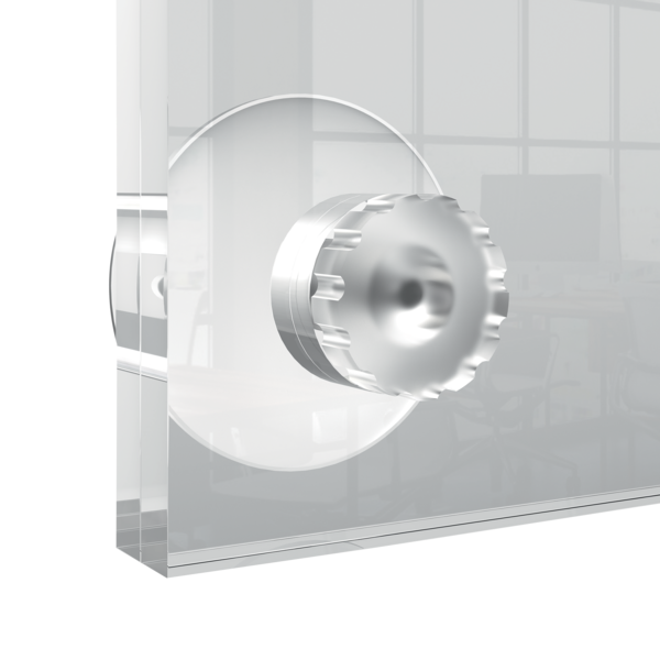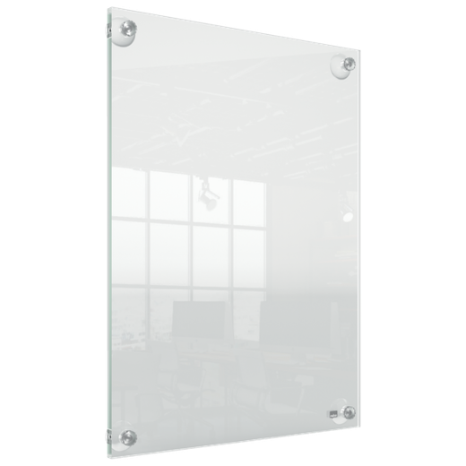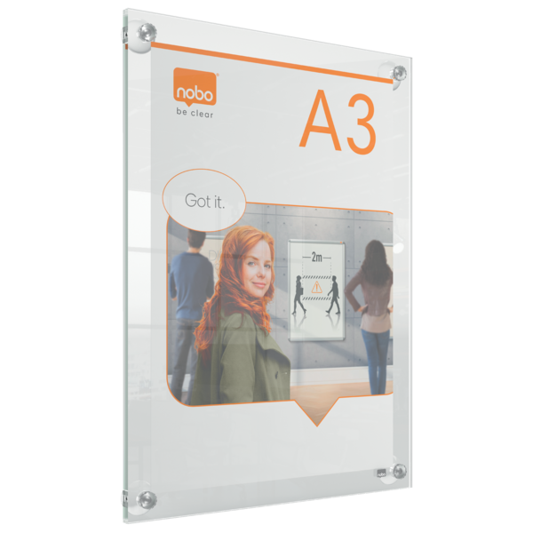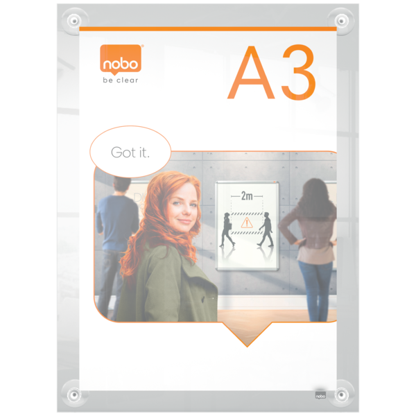 Porta póster acrílico con un diseño moderno sin marco que cuenta con cuatro soportes de esquina con ventosas. Ideal para un cambio de contenido rápido y sencillo. Tamaño de la superficie de exposición A3 para mostrarse como un elemento elegante y contemporáneo. | Referencia Deskidea: ACC1915599