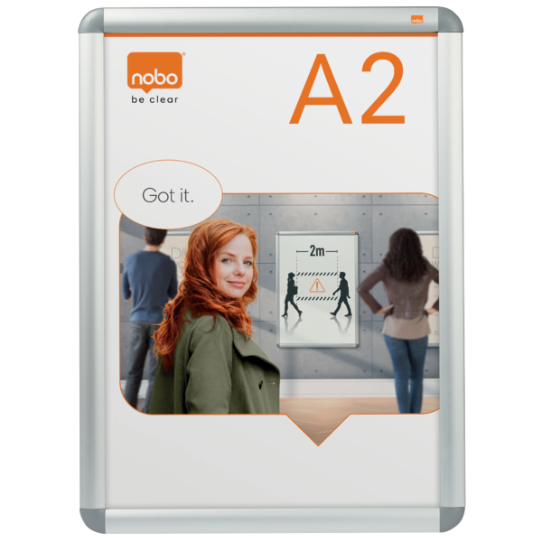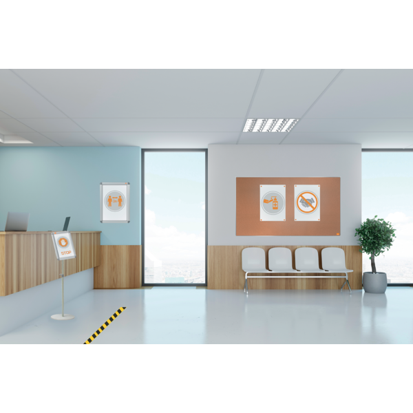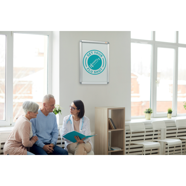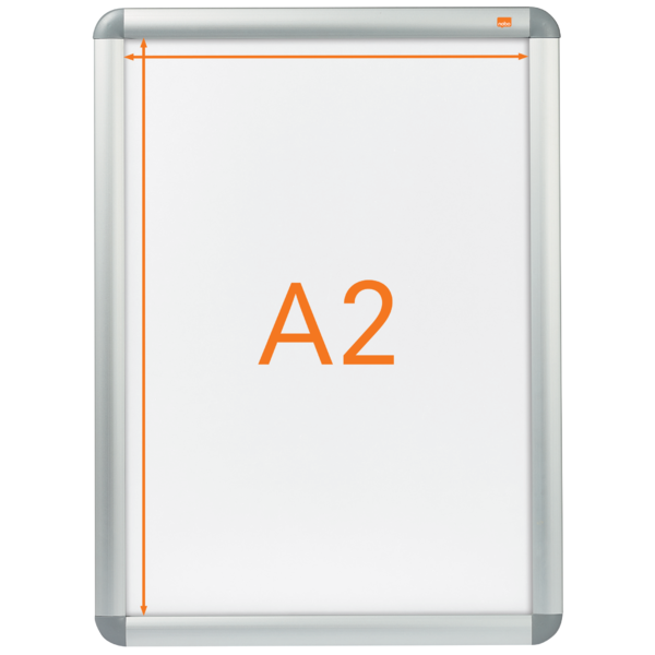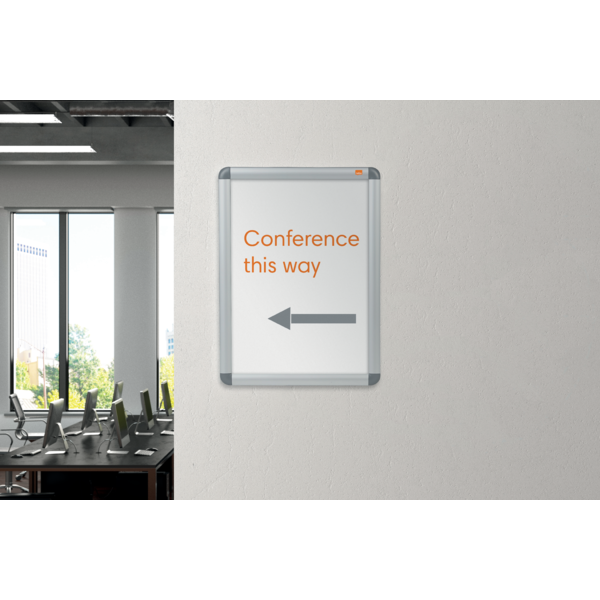 Portacartel de pared con marco para póster, bordeado por un embellecedor de aluminio a presión, con cubierta protectora antideslumbrante. Tamaño de la superficie de exposición A2. | Referencia Deskidea: ACC1902212