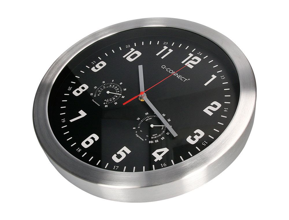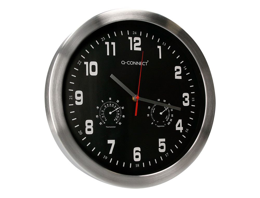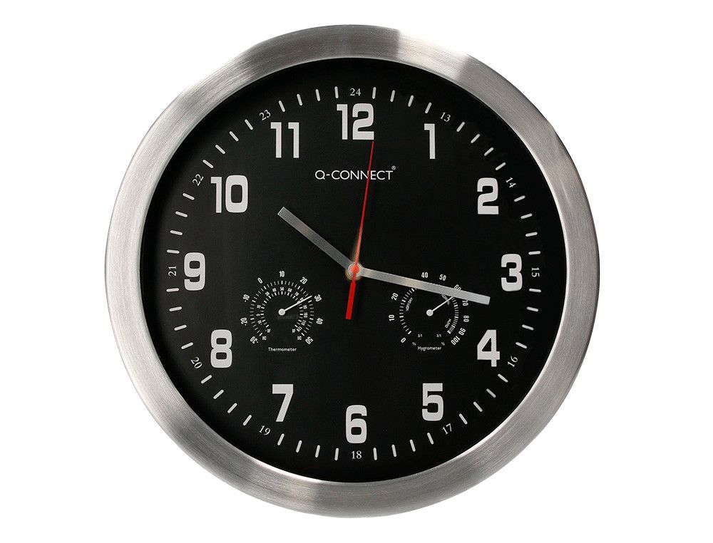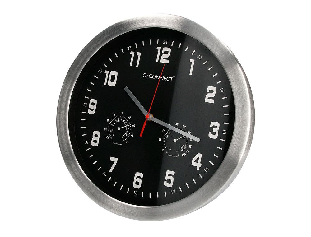 El reloj de pared Q-Connect combina un elegante diseńo moderno con funcionalidad, gracias a su marco cromado y esfera negra. Disfruta de números grandes que facilitan la lectura, un mecanismo silencioso y la inclusión de termómetro e higrómetro para el ambiente. ˇPerfecto para cualquier espacio! | Referencia Deskidea: 163919