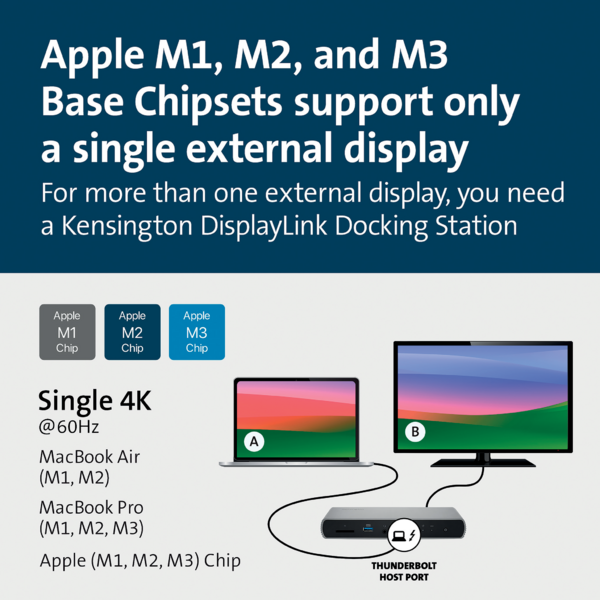 - Admite una salida 8K a 60 Hz a través de un puerto Thunderbolt 4, cuando DSC está activado, o dos salidas 4K a 60 Hz a través de dos puertos HDMI. Los MacBook con chipset base M1/M2/M3 o los portátiles con USB-C en modo Alt solo admiten una única pantalla externa.
