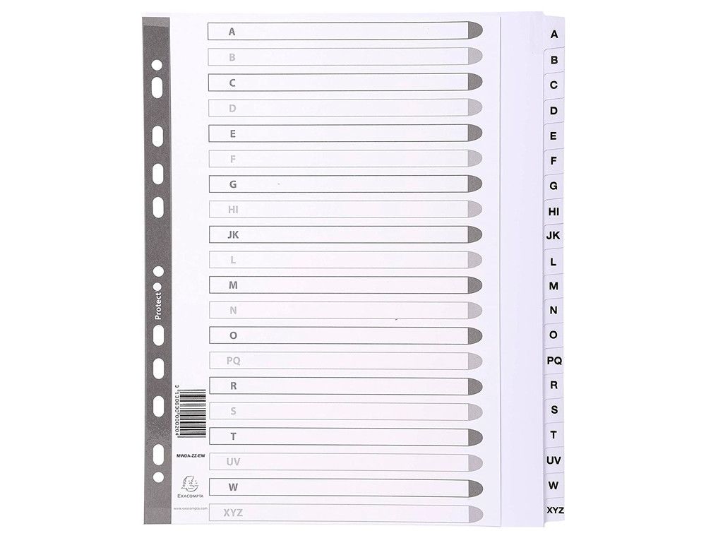 Organiza tu documentación con el juego de 20 separadores alfabéticos Exacompta. Hechos de cartulina blanca de 160g/m˛, estos separadores DIN A4 cuentan con carátula para índice, perfectos para mantener todo a la mano y en orden. | Referencia Deskidea: 156017