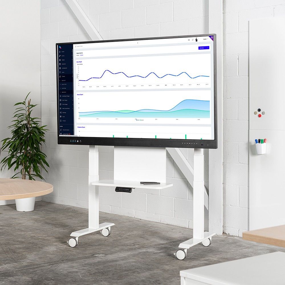 Descubre el soporte para monitores interactivos, diseñado para pantallas de 65'', 75'' y 86''. Con altura ajustable eléctricamente y ruedas con freno, es práctico para cualquier presentación. ¡Llévalo donde quieras y presenta con estilo! | Referencia Deskidea: RCDINTERAC-ST6