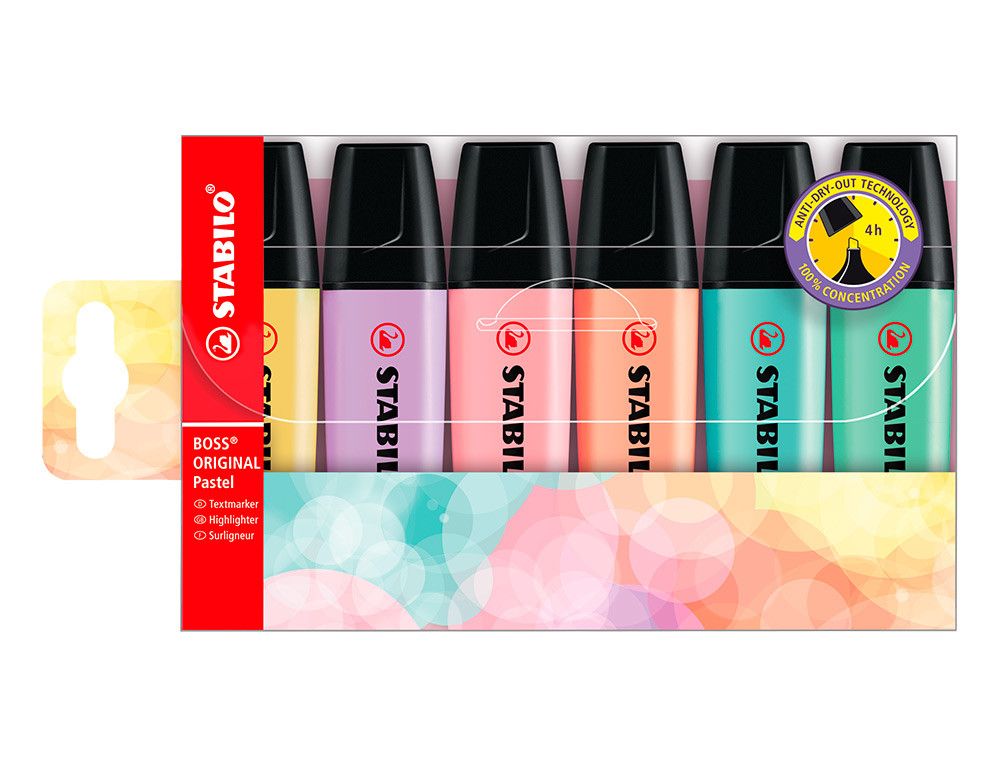 Descubre el estuche STABILO BOSS PASTEL que incluye 6 marcadores fluorescentes en tonalidades suaves y elegantes. Perfectos para dar un toque colorido y creativo a tus notas, resaltar ideas y hacer que cada página cobre vida con la gama más amplia de colores en el mercado. | Referencia Deskidea: 64353