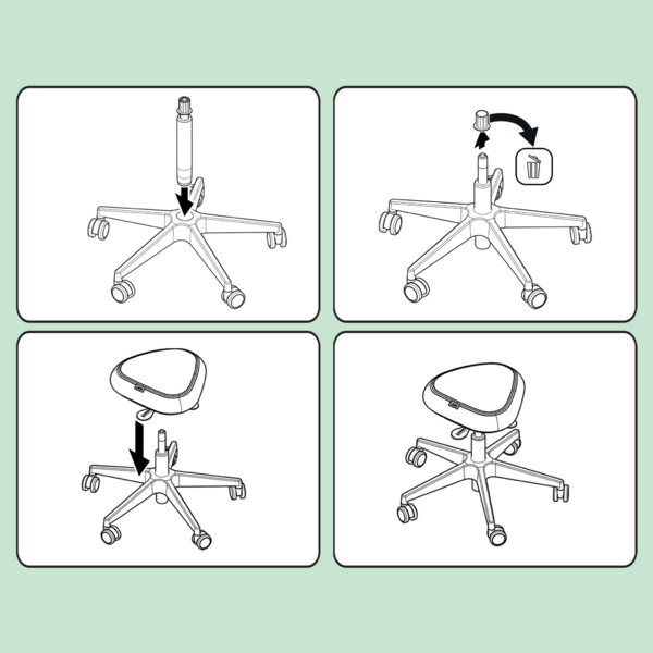 - Asiento confortable de espuma de doble densidad (DDF) de forma triangular con un núcleo de soporte ergonómico firme para distribuir el peso uniformemente por la pelvis, rodeado de un suave acolchado de espuma para reducir la presión sobre los muslos y las piernas, similar a un taburete de silla de montar