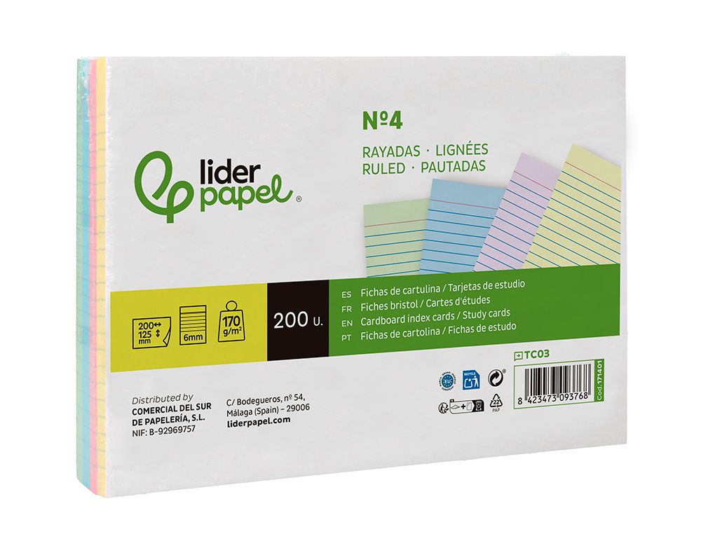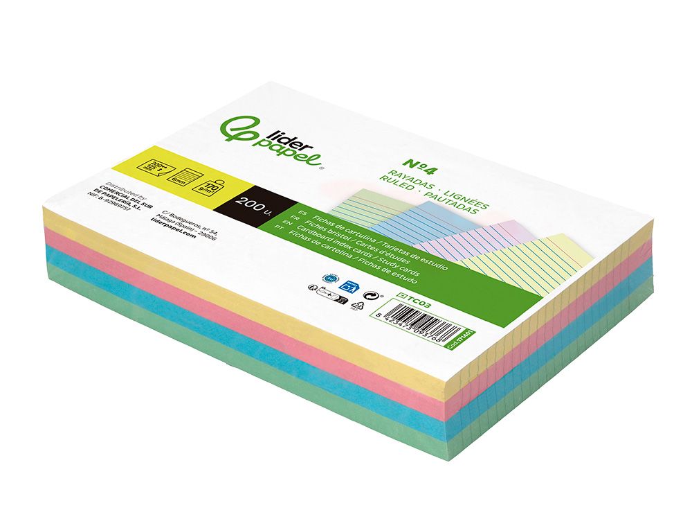 Tarjeta liderpapel para estudiar rayada cartulina de colores 170gr 125x200mm paquete de 200 unidades