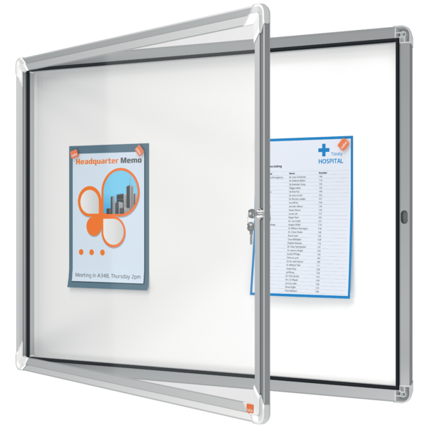 Descubre la Vitrina NOBO Premium Plus para exteriores, diseñada para mostrar 8 hojas A4. Con superficie blanca magnética, puerta de seguridad y marco de aluminio, es perfecta para proteger tus documentos en cualquier clima. | Referencia Deskidea: ACC1902579